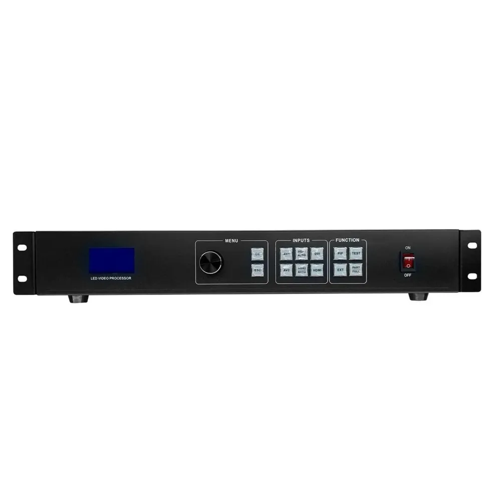 Procesador de video para pantallas LED con escalado y conmutación de múltiples fuentes.